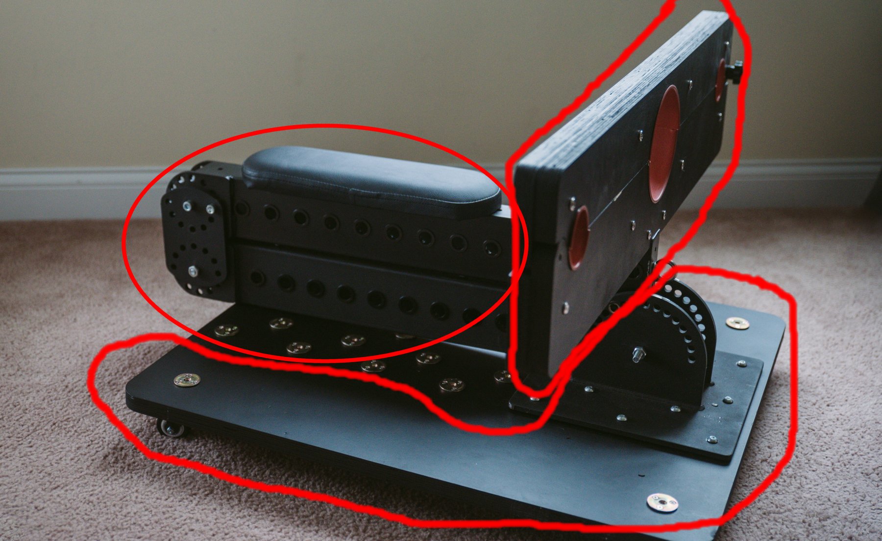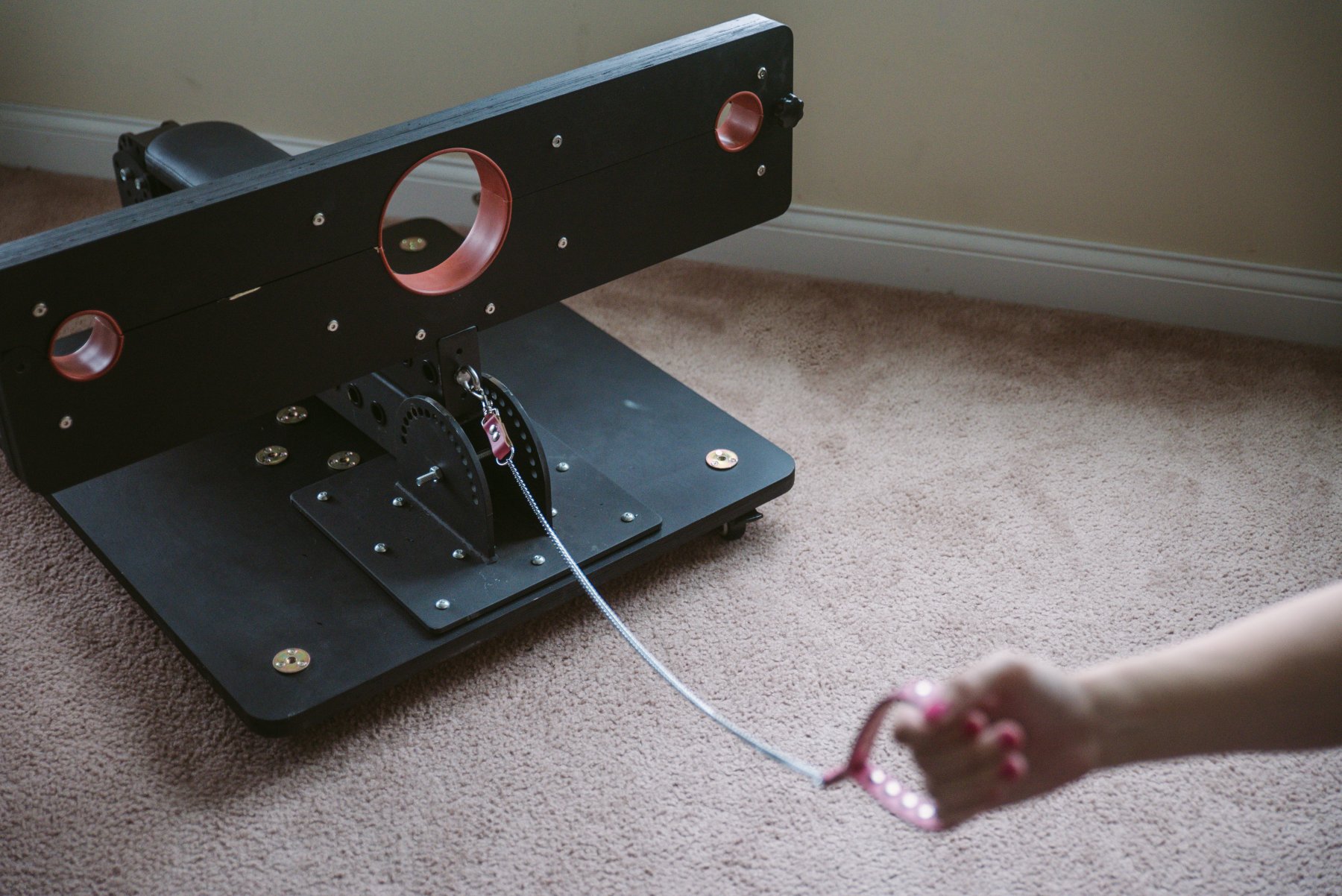 - There isn’t an easy “pushing” spot. This is also part of why I worry about it tipping. If you want to look Domme-ly and easily push this around while remaining upright, you’ll need to push somewhere, and there is no handle. That spot is probably some part of your partner (or the bondage furniture), and it places horizontal forces on the furniture far away from the flat, stable base.