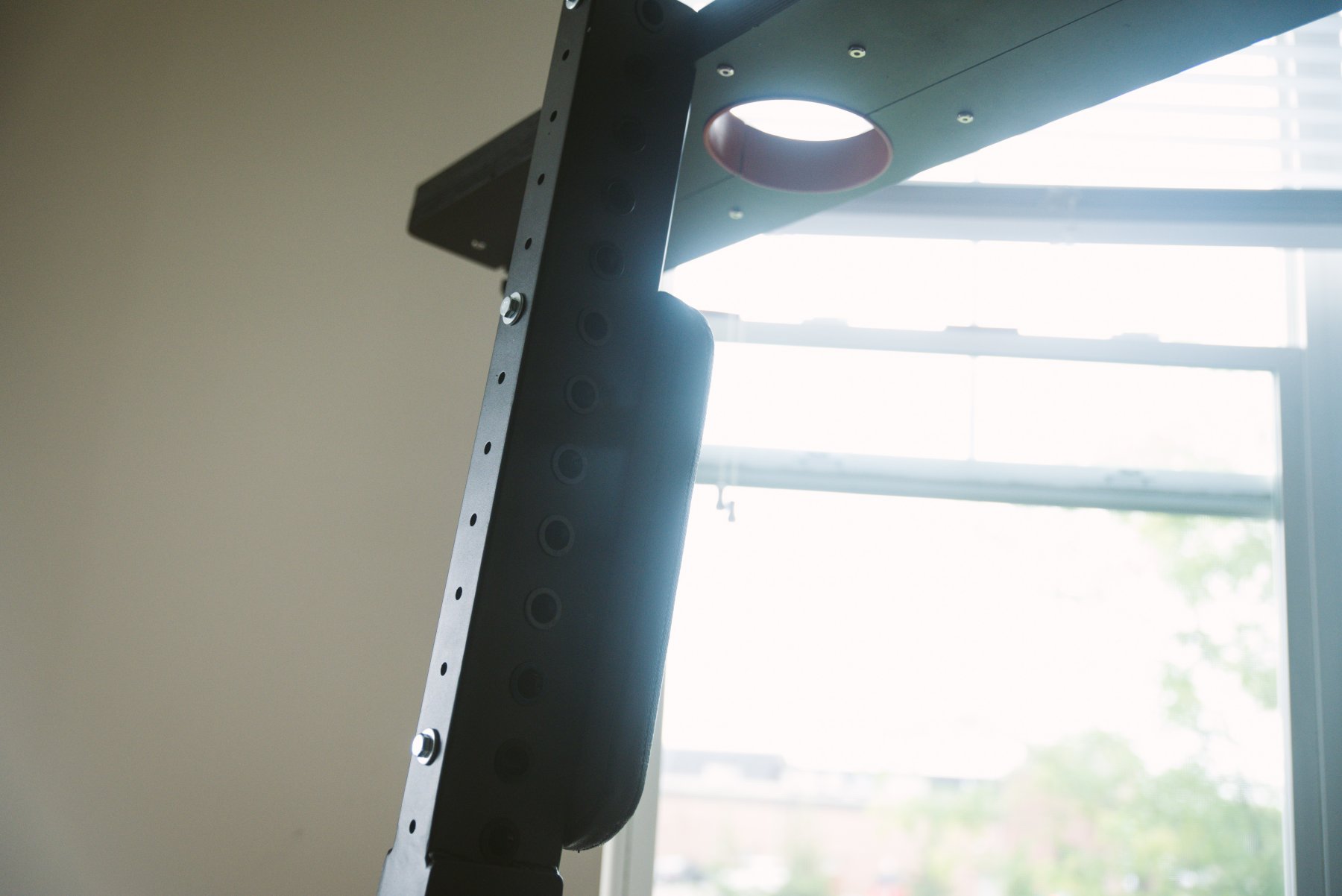 - Attach the post for the leg cuffs (if desired). Thread the leg cuff spreader bar through the hole for the leg cuffs (if desired).