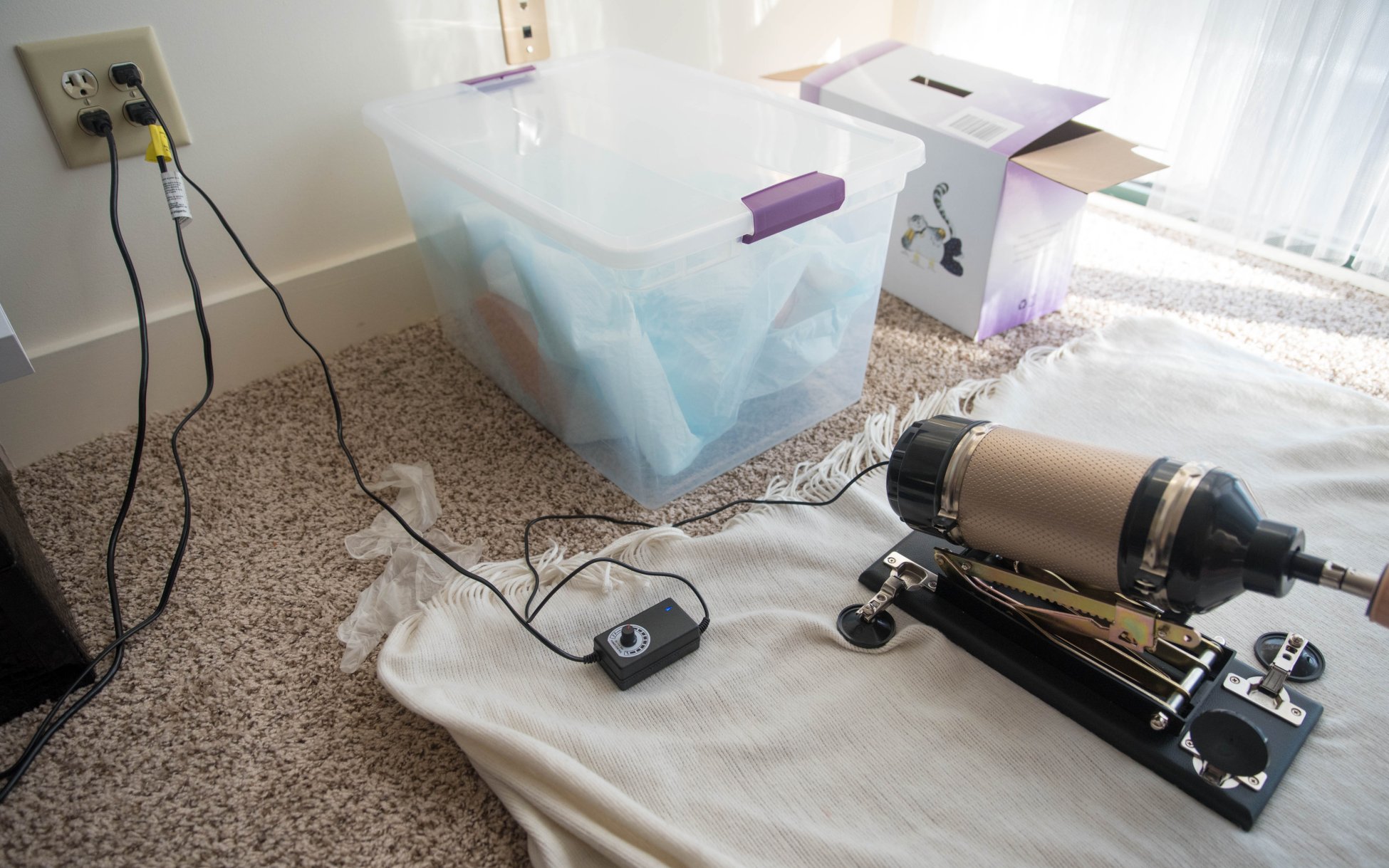 (Fun tip: If you’re trying to use the Hismith Sex Machine on carpet, use the lid of a plastic tote for a suction-cup-friendly surface. A budget sex machine like this is generally lighter in weight, making it easier to slide along carpet. If you’re still having issues with it, you can always use the Hismith sex machine while it’s propped up against the wall or unmovable, large furniture like we do.)