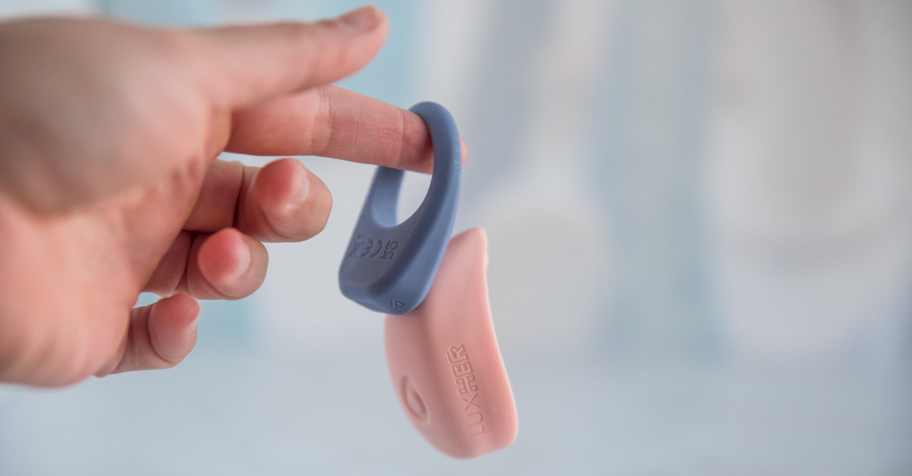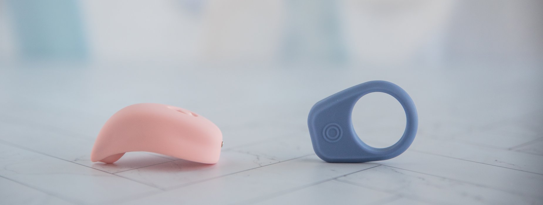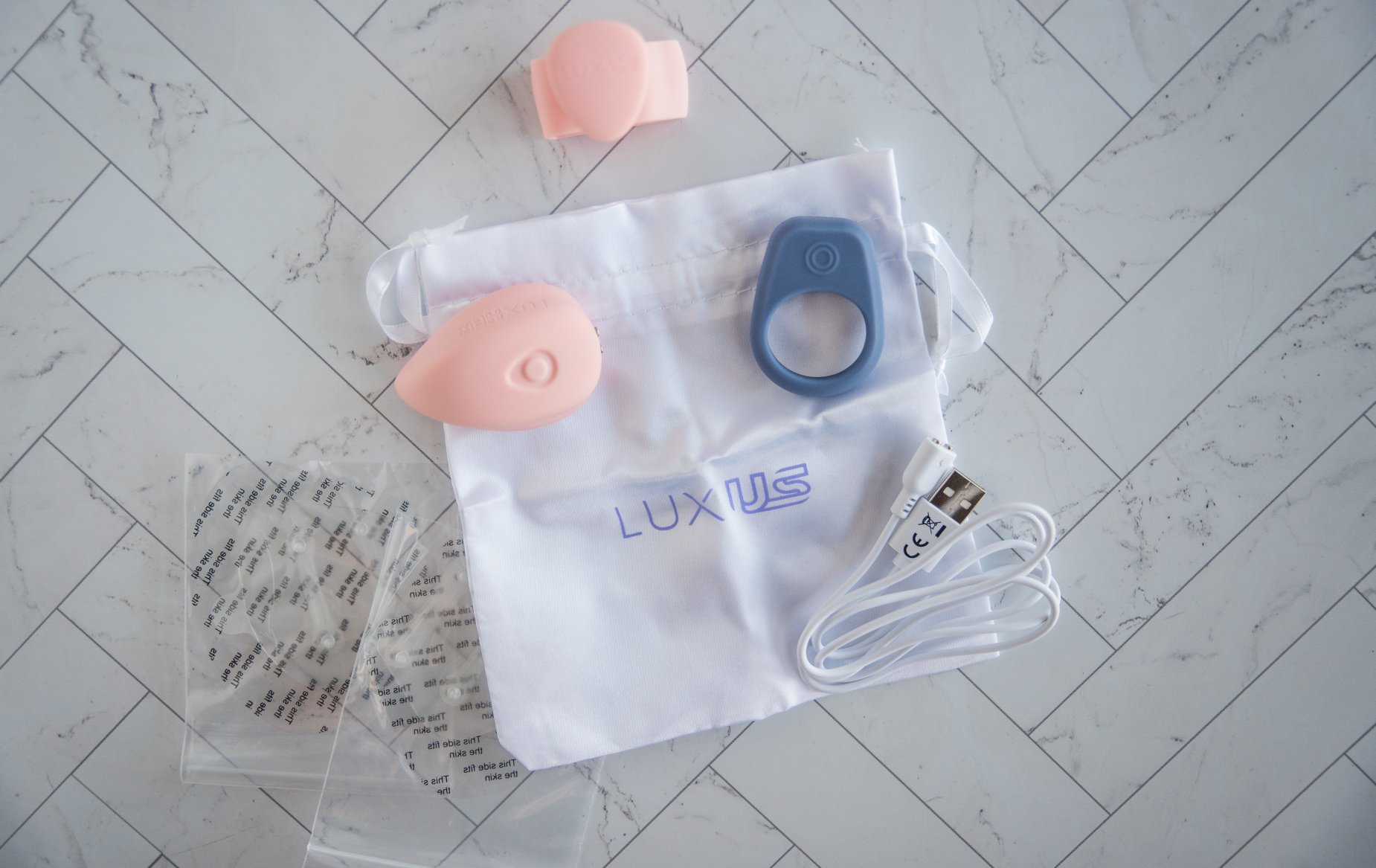 The pink LuxHer vibrator (which provides clitoral pleasure) has a motor that can respond to a magnet’s presence. The blue LuxHim cock ring (which wraps around the shaft but has no moving/vibrating function) is equipped with a strong magnet.