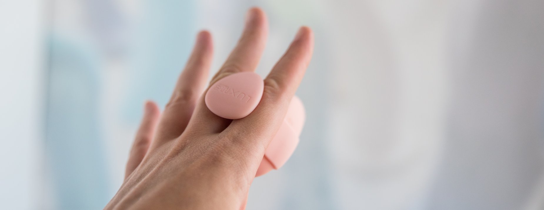 The 2 Adhesive Stickers are just that: stickers that match the shape and size of the LuxHer and allow the vibrator to “stick” onto your body. The underside of the LuxHer vibrator has four little empty holes. There are four stick-out “posts” built into the Adhesive Sticker. You push the vibrator firmly onto the Adhesive Sticker, and it snaps into these “posts”, attaching the vibrator temporarily to the Adhesive Sticker.