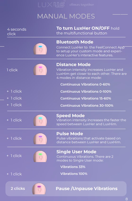 - Pair the LuxHer vibrator with the functionality of a KIIROO stroker or other KIIROO toy, allowing the two toys to sync up their sensations for mutual shared pleasure while apart