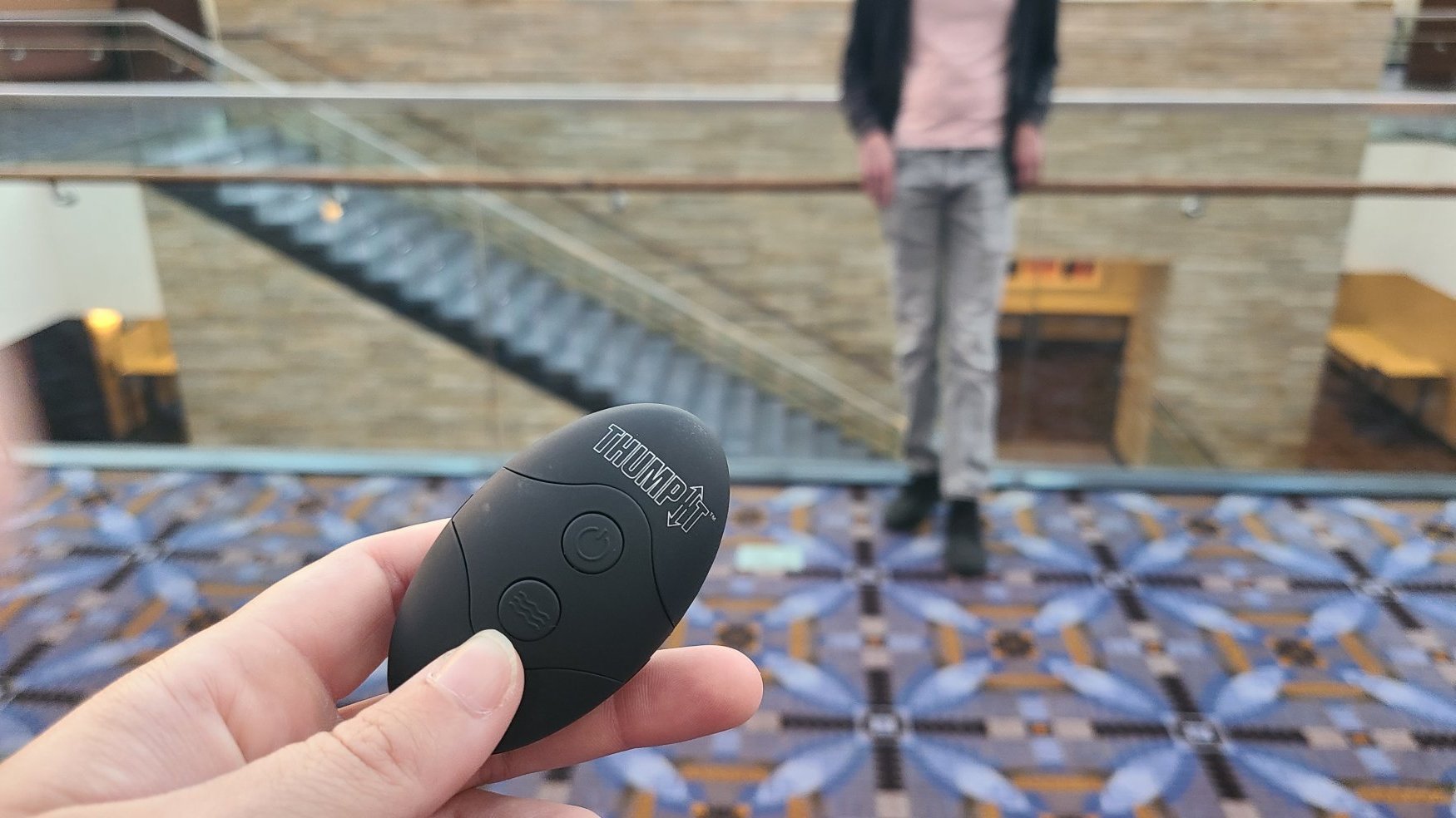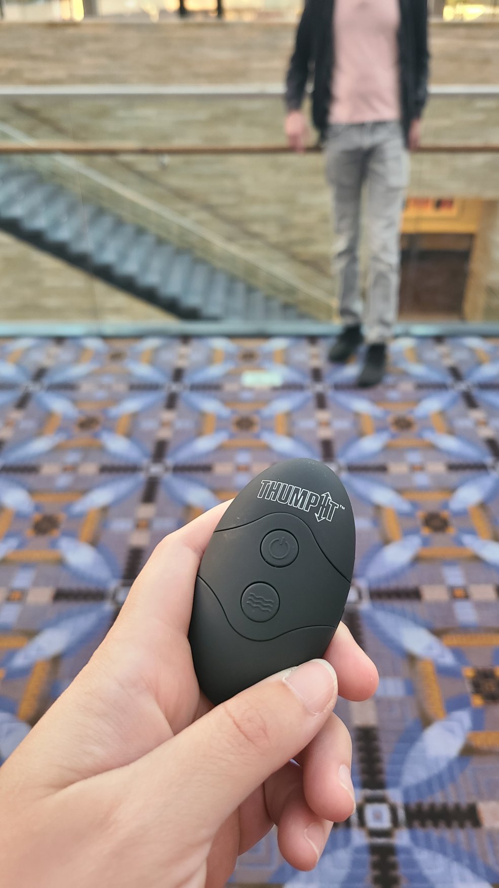Close-up on a sex toy remote control which is held in my hand. It's pointing at the crotch of my submissive who is standing in the background of the shot in the middle of a conference center. Article for my scenes for public femdom teasing article.